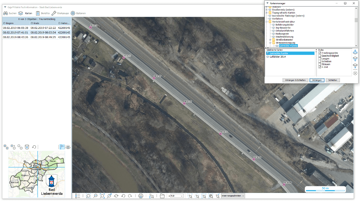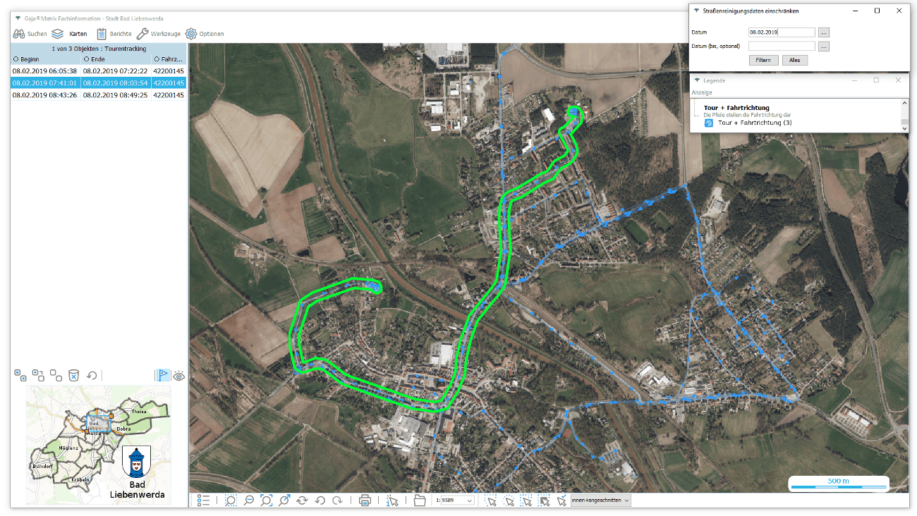 Fahrtweg und Aktivitätenvsiualisierung mit Legende klären, ob an einer fraglichen Stelle im fraglichen Zeitraum z.B. gestreut wurde.