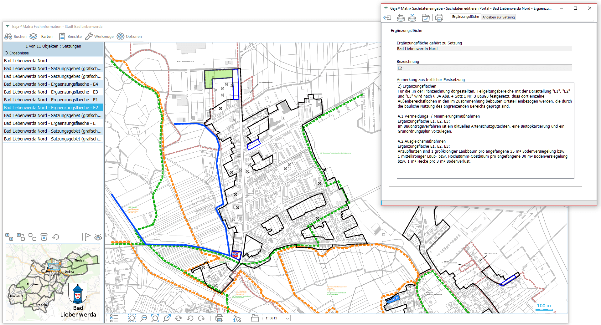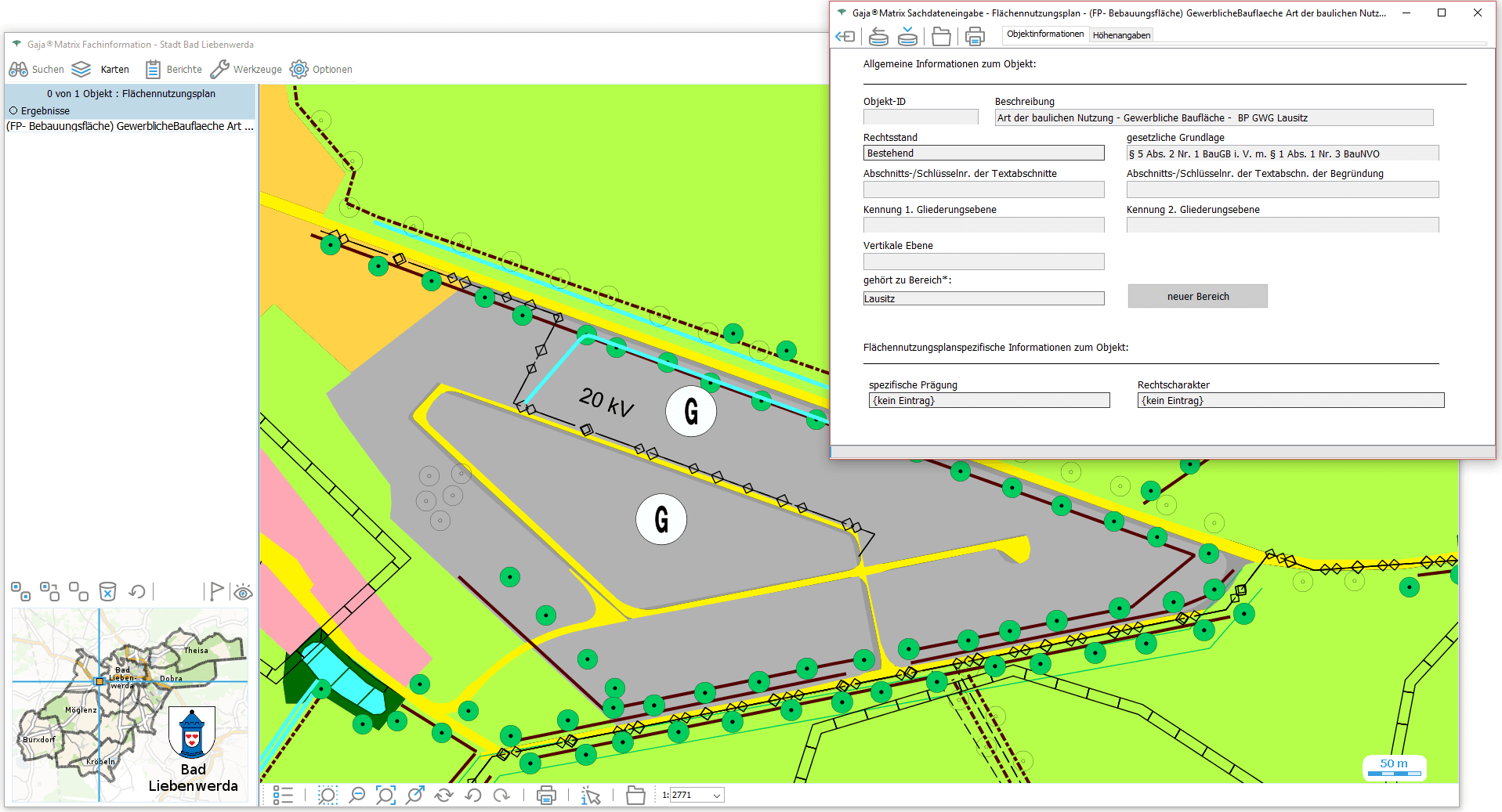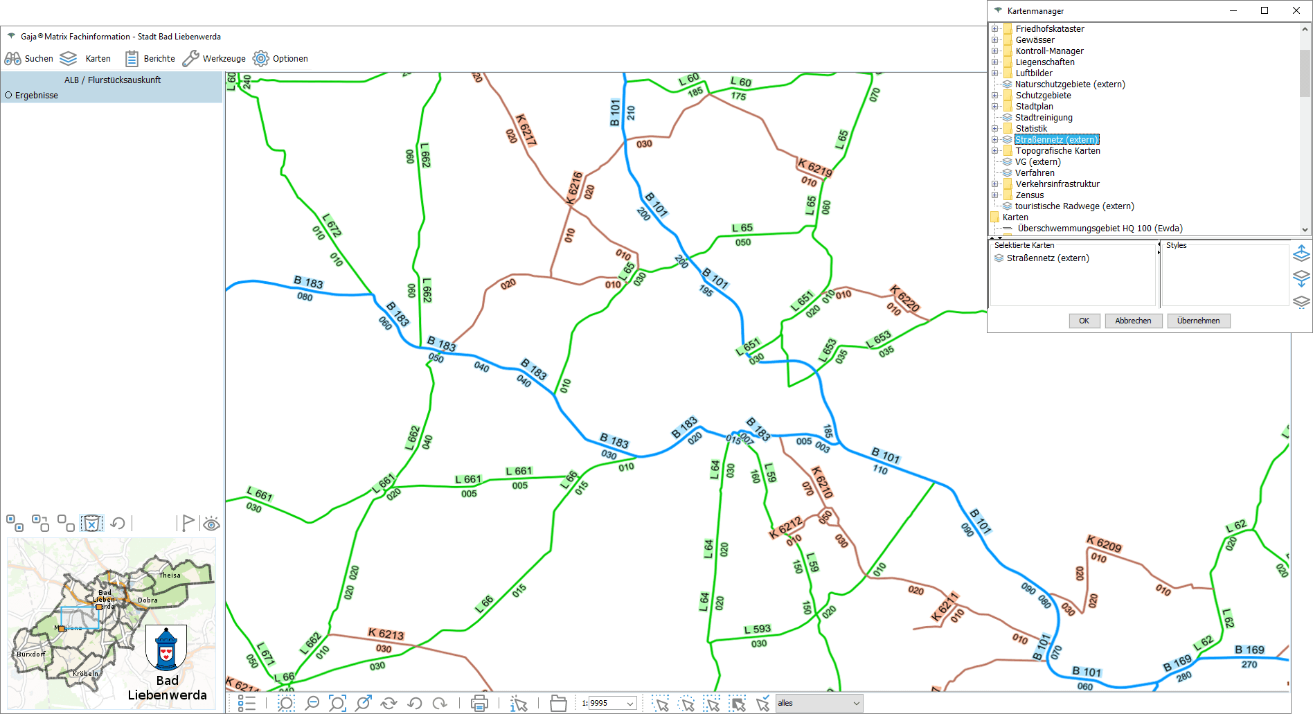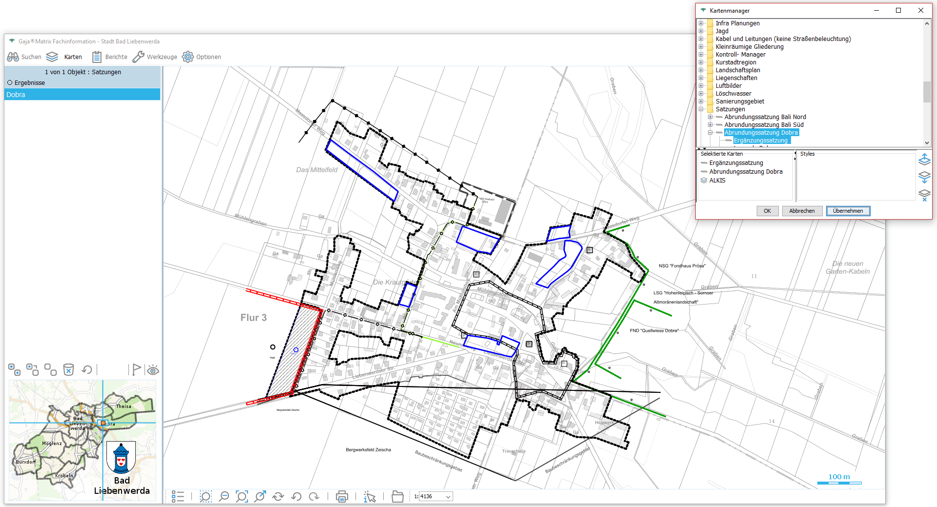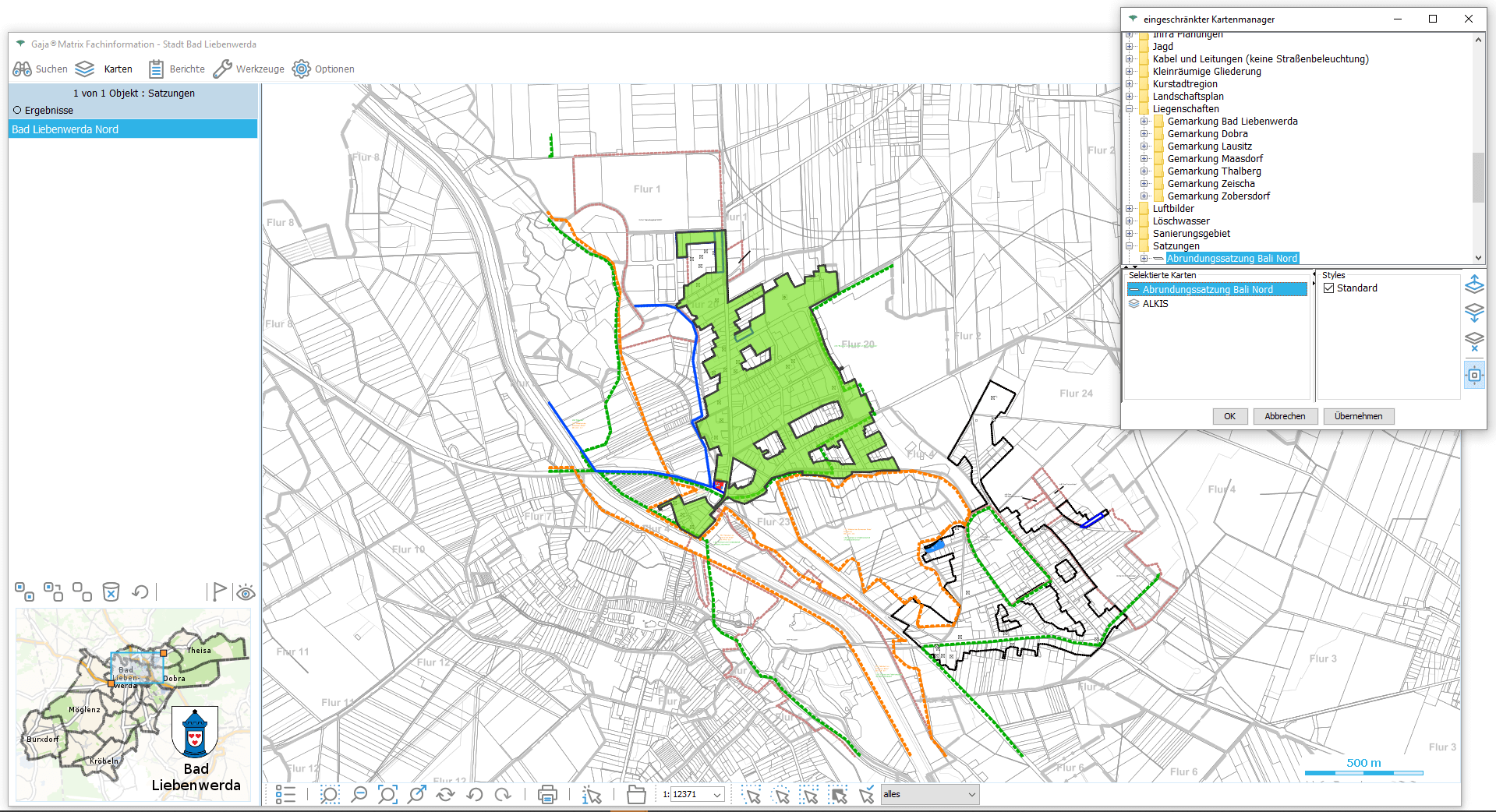 Nun genügt ein Klick auf den jeweiligen Eintrag, um die Daten aus der GDI-BrB mit jeweils aktuellem Inhalt lagerichtig mit beliebigen GajaMatrix-Katastern zu kombinieren.