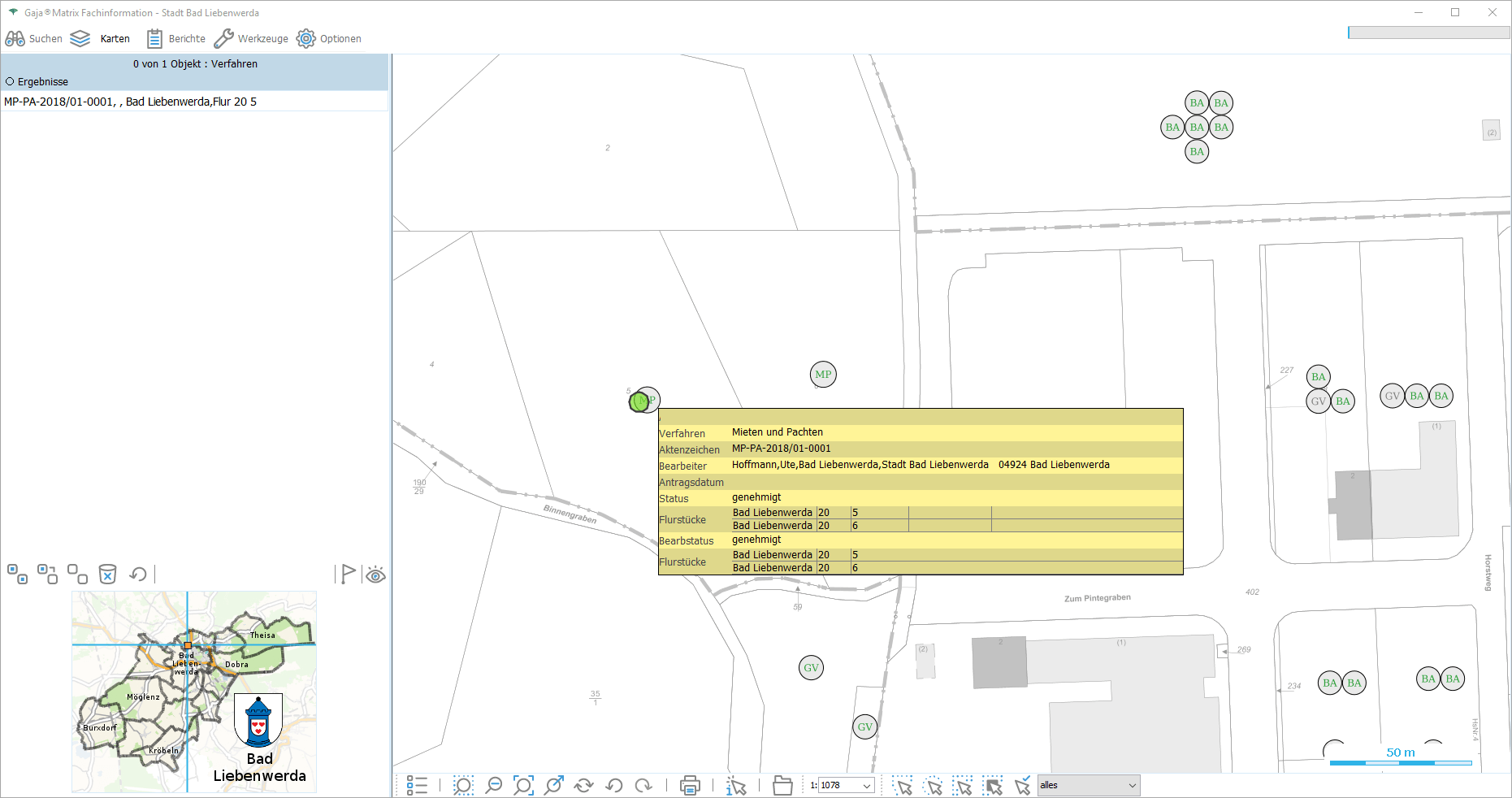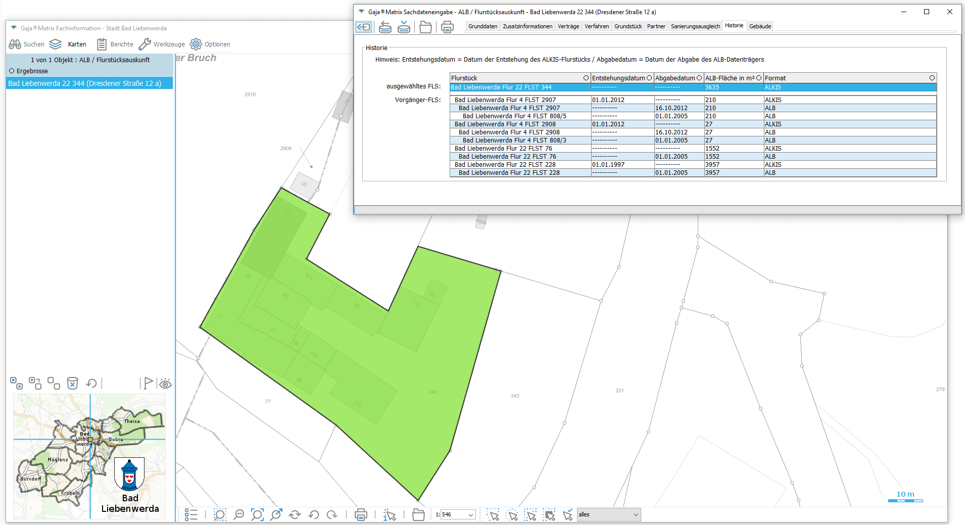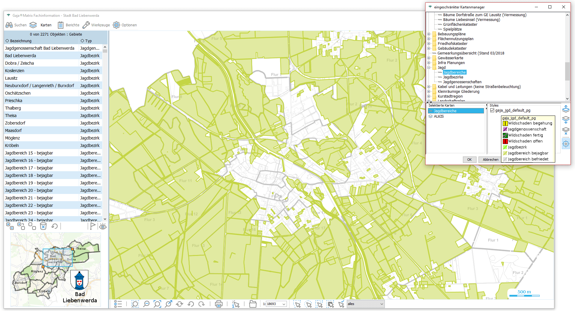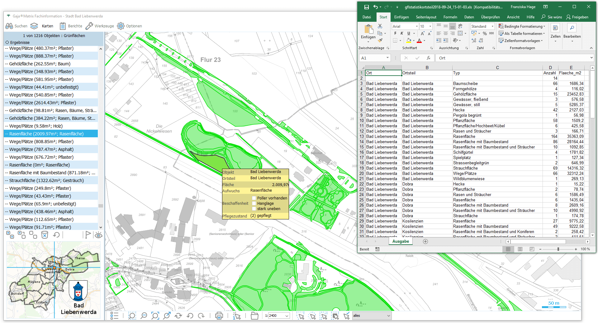 Nun genügt ein Klick auf den jeweiligen Eintrag, um die Daten aus der GDI-BrB mit jeweils aktuellem Inhalt lagerichtig mit beliebigen GajaMatrix-Katastern zu kombinieren.