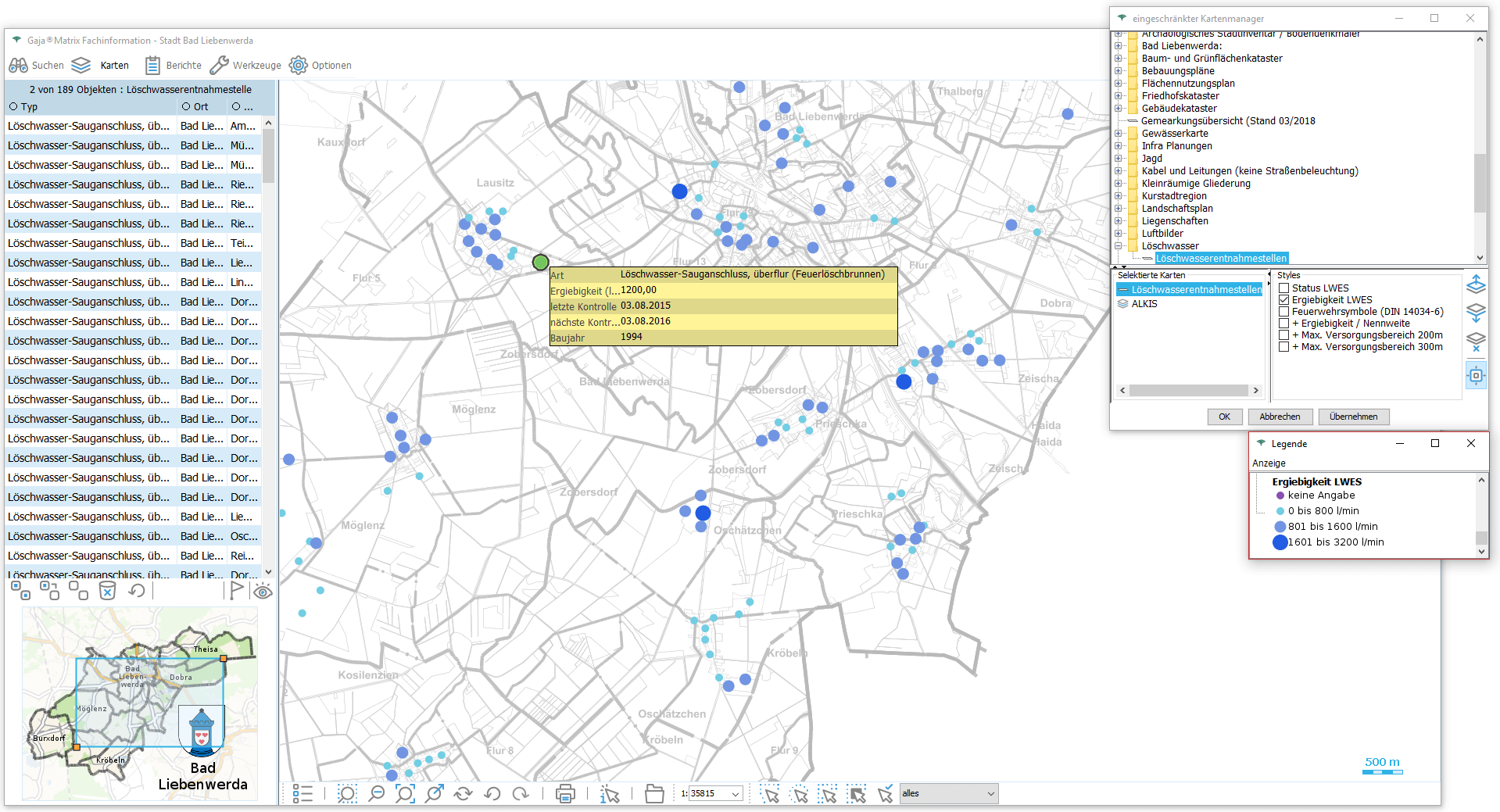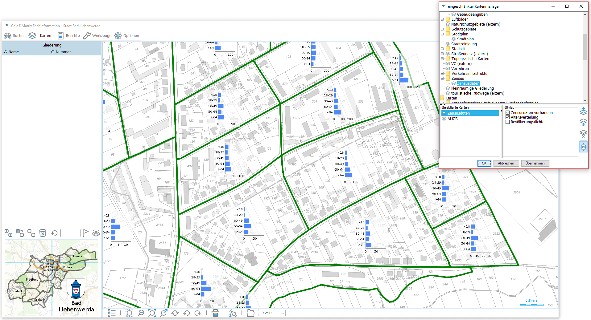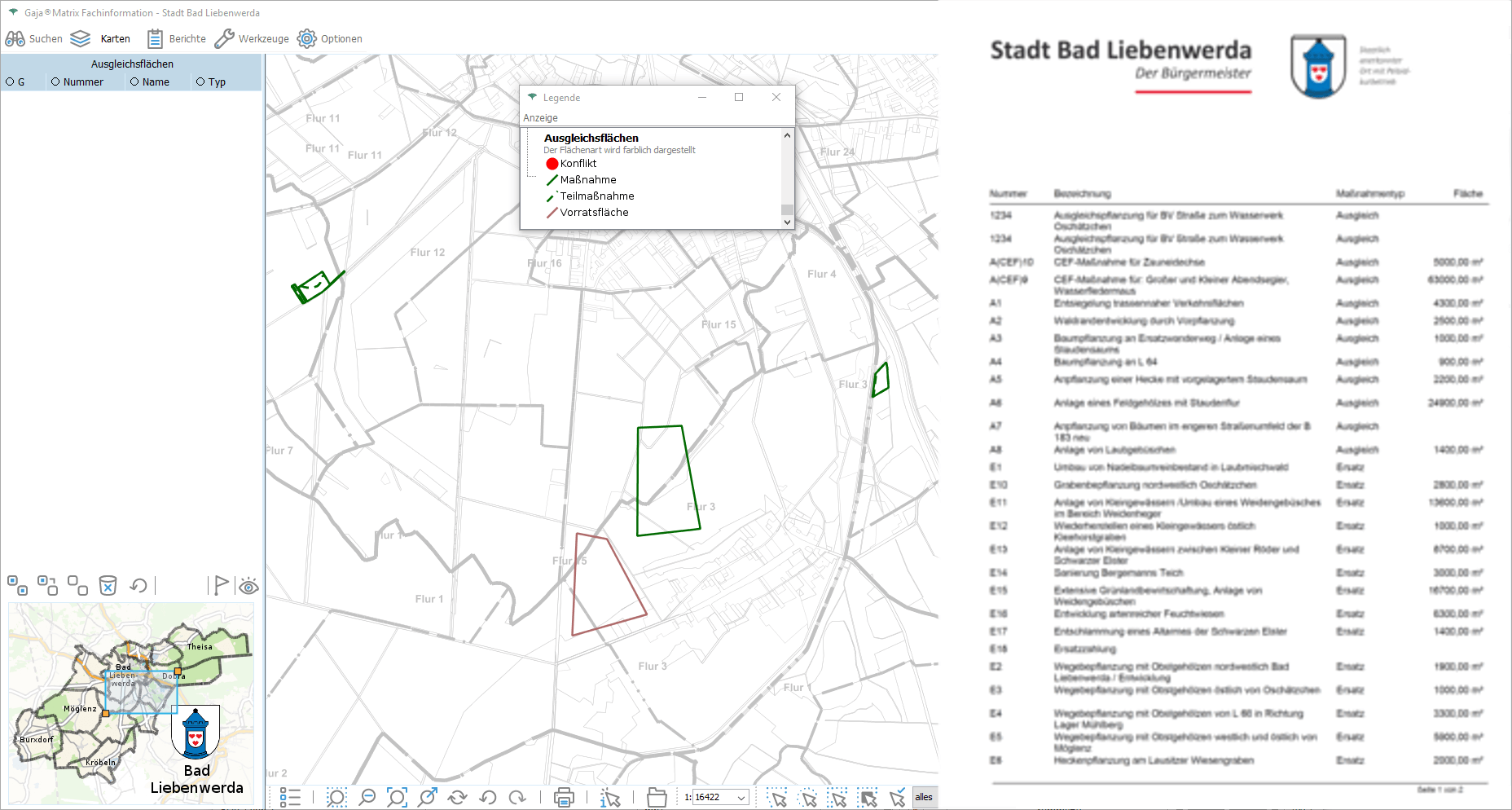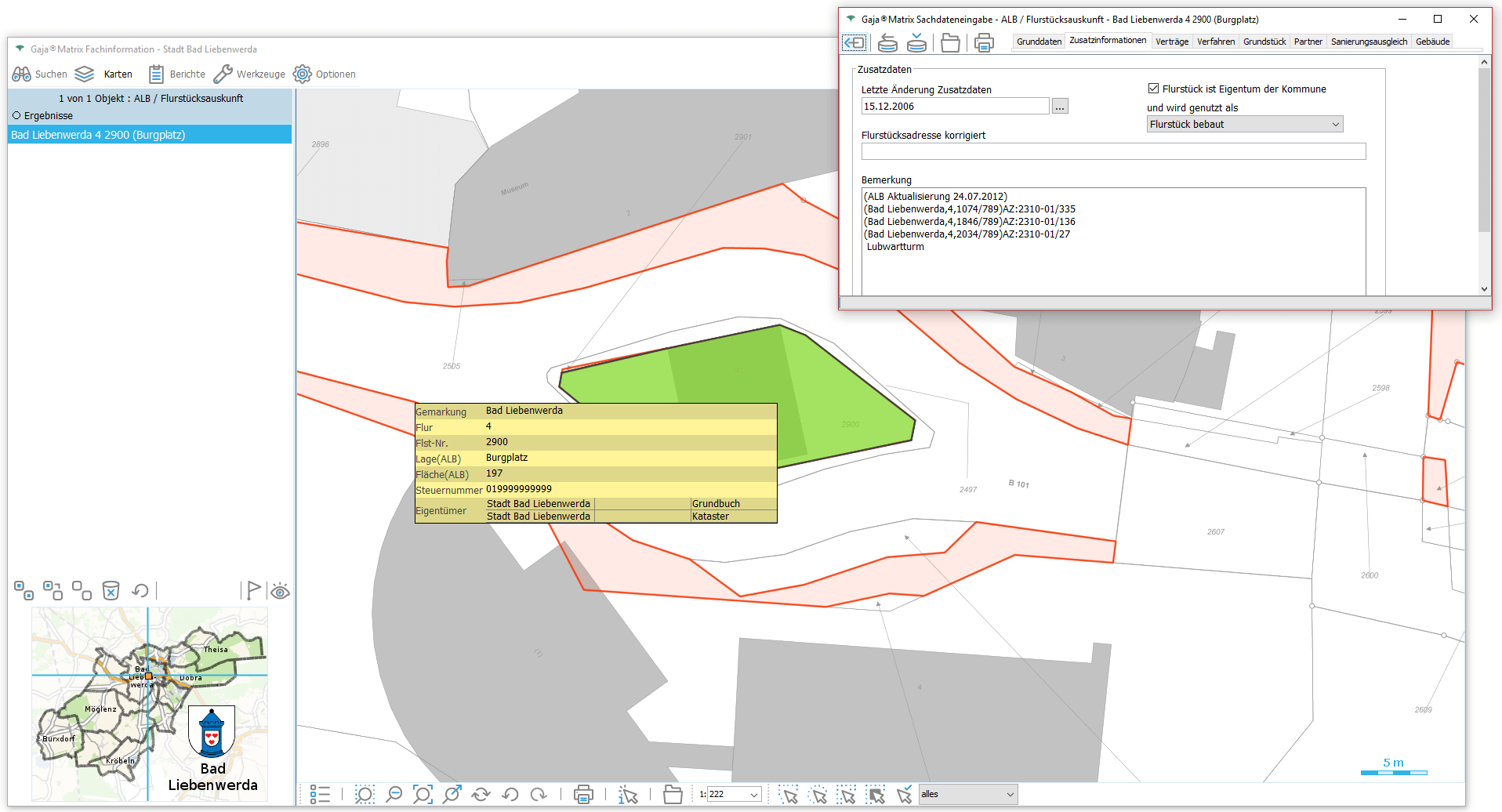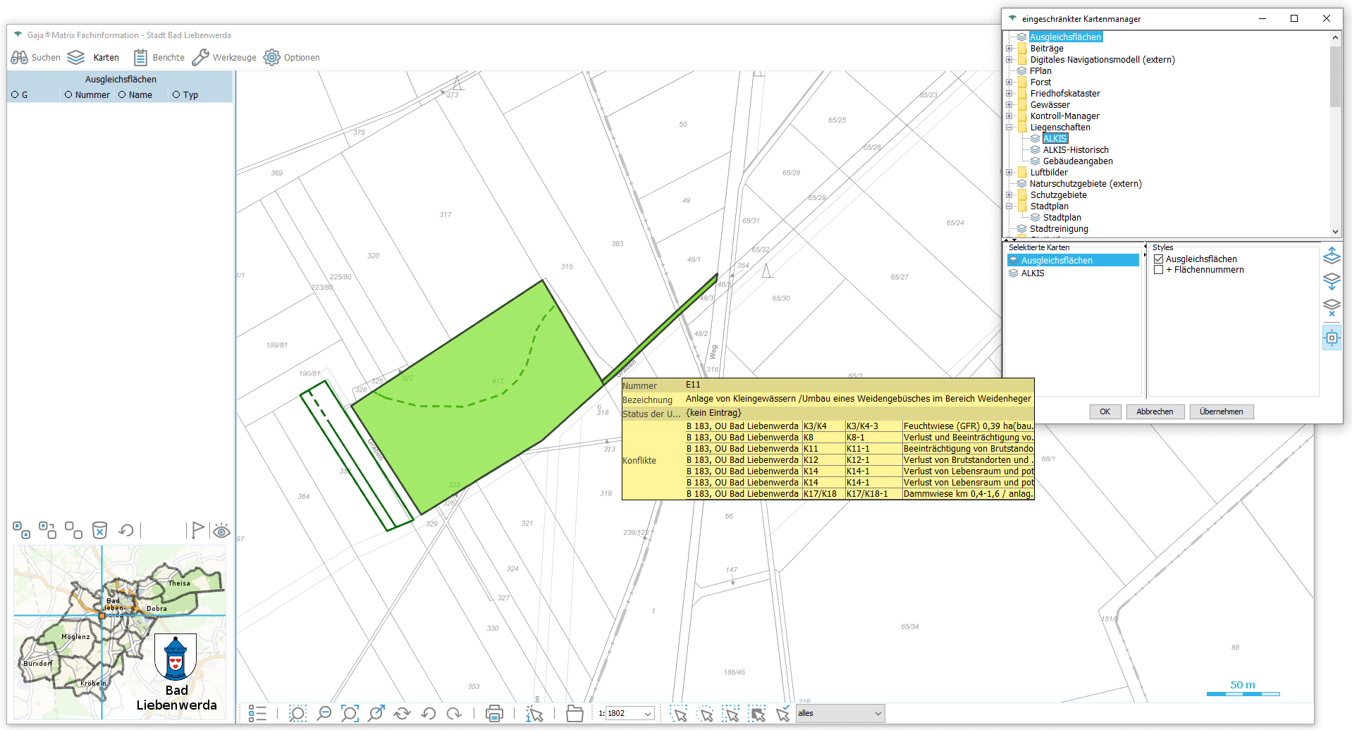 Nun genügt ein Klick auf den jeweiligen Eintrag, um die Daten aus der GDI-BrB mit jeweils aktuellem Inhalt lagerichtig mit beliebigen GajaMatrix-Katastern zu kombinieren.