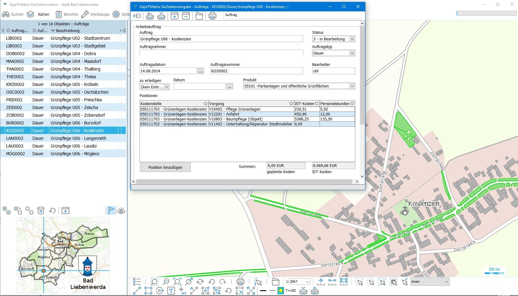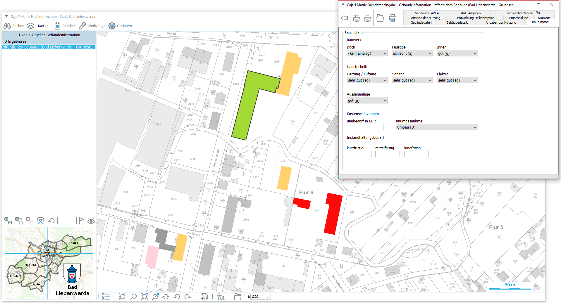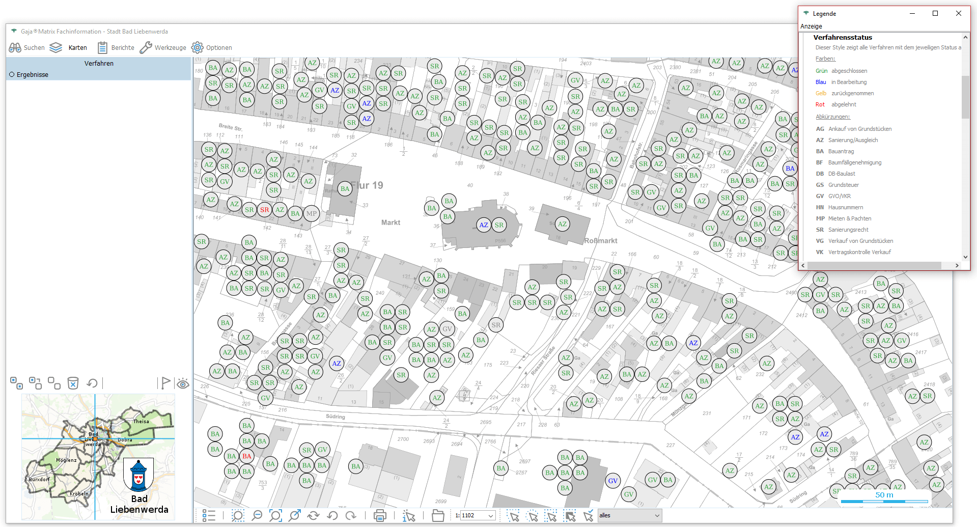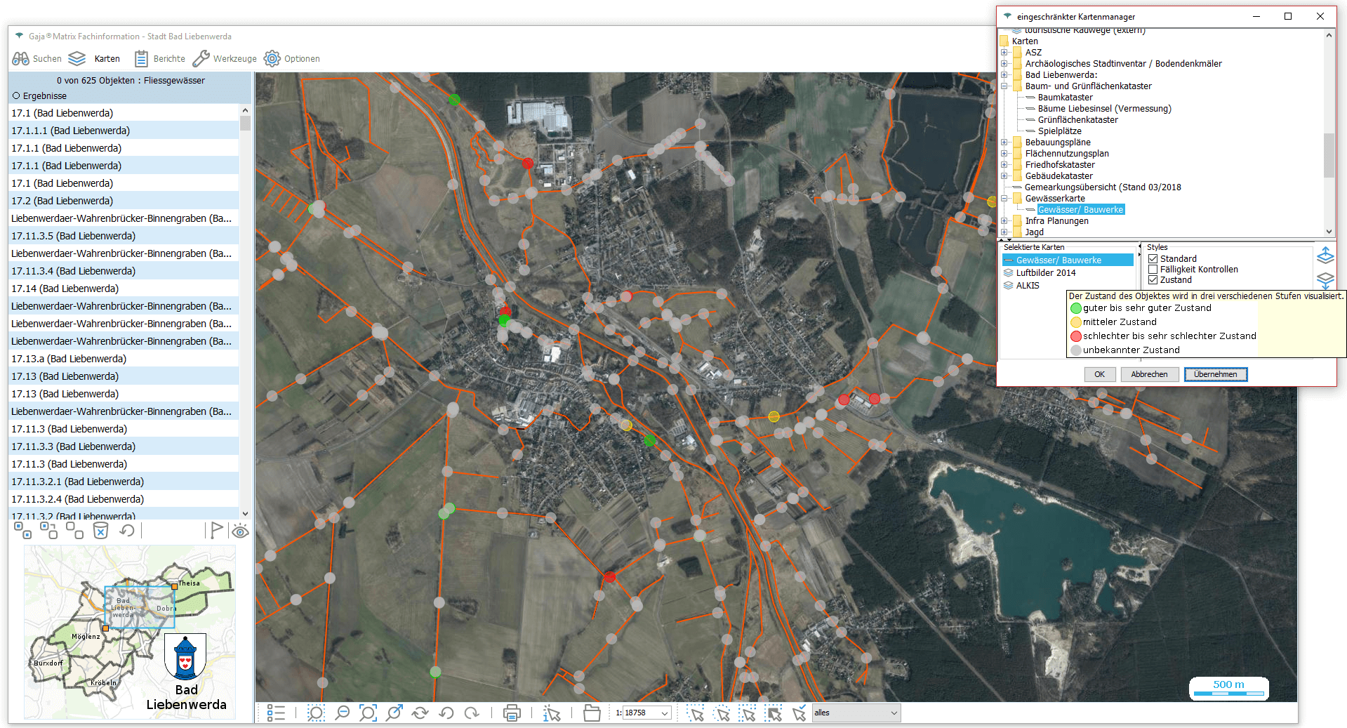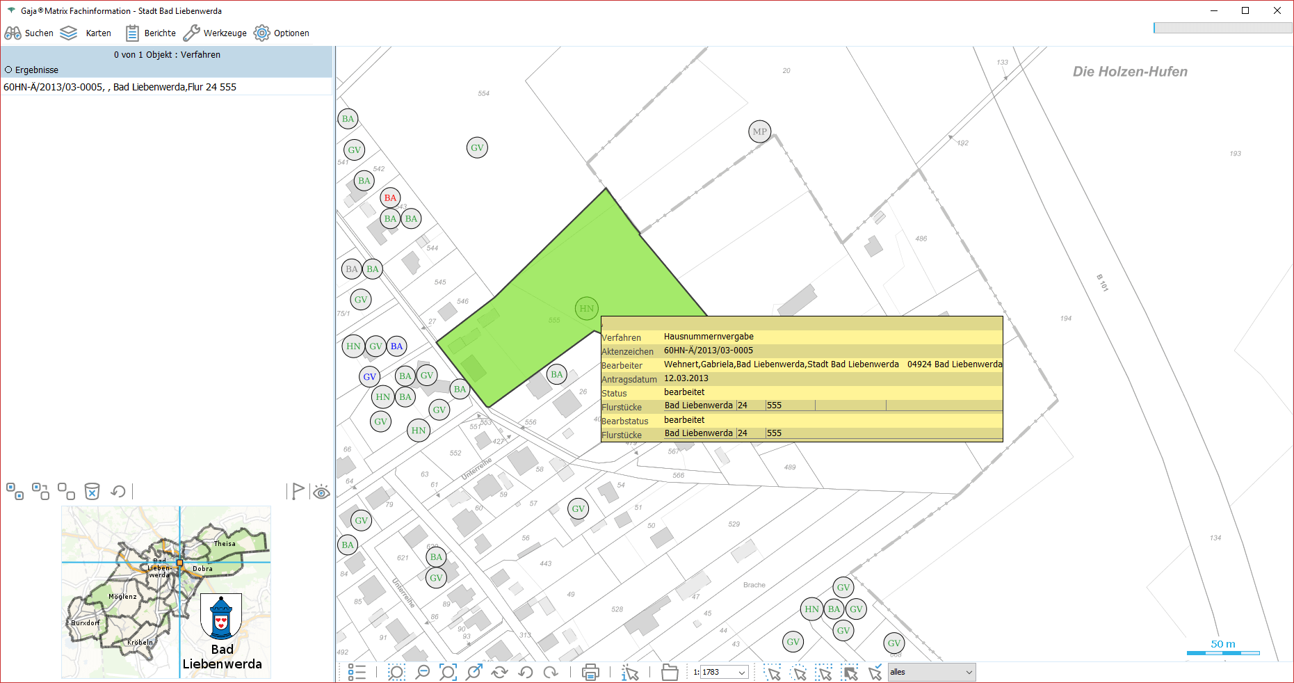 Nun genügt ein Klick auf den jeweiligen Eintrag, um die Daten aus der GDI-BrB mit jeweils aktuellem Inhalt lagerichtig mit beliebigen GajaMatrix-Katastern zu kombinieren.