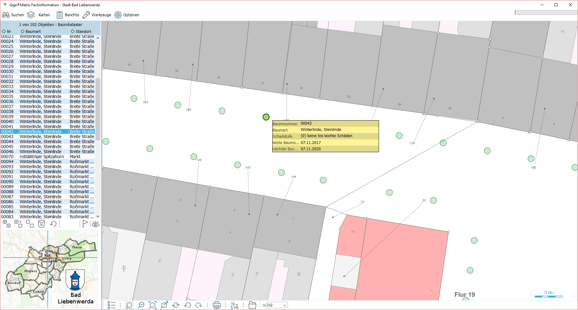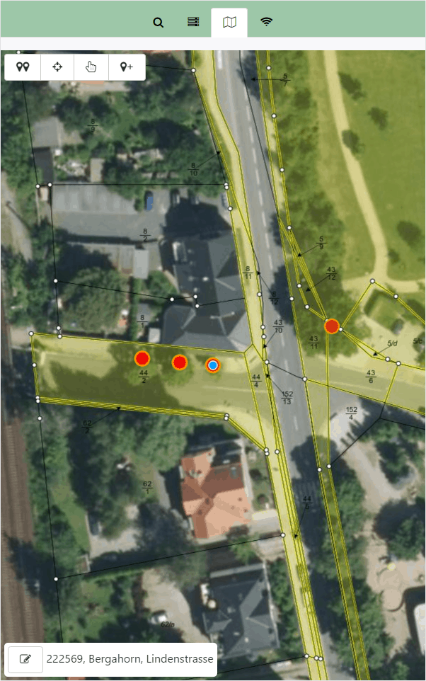 Oder durch einfaches Antippen von Objekten mit der Maus auf zugeschalteten Fachkarten anderer Sachgebiete. Hier: Baumkarte & ToolTipp.