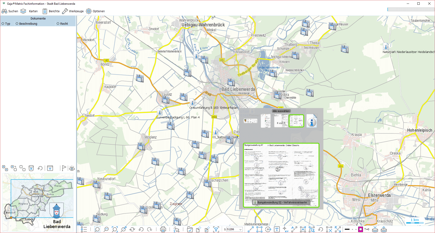 Anders als mit klassischen Dokumentenmanagementsystemen können in Gaja®Matrix Fotos und Dokumente beliebigen Örtlichkeiten und Objekten zugeordnet und geokodiert gespeichert werden. Über eine zuschaltbare Dokumentenfachkarte haben nun alle Sachgebiete einen visuellen Überblick über vorhandene Dokumente und bei Befugnis auch die Möglichkeit zum Lesen und Ändern.