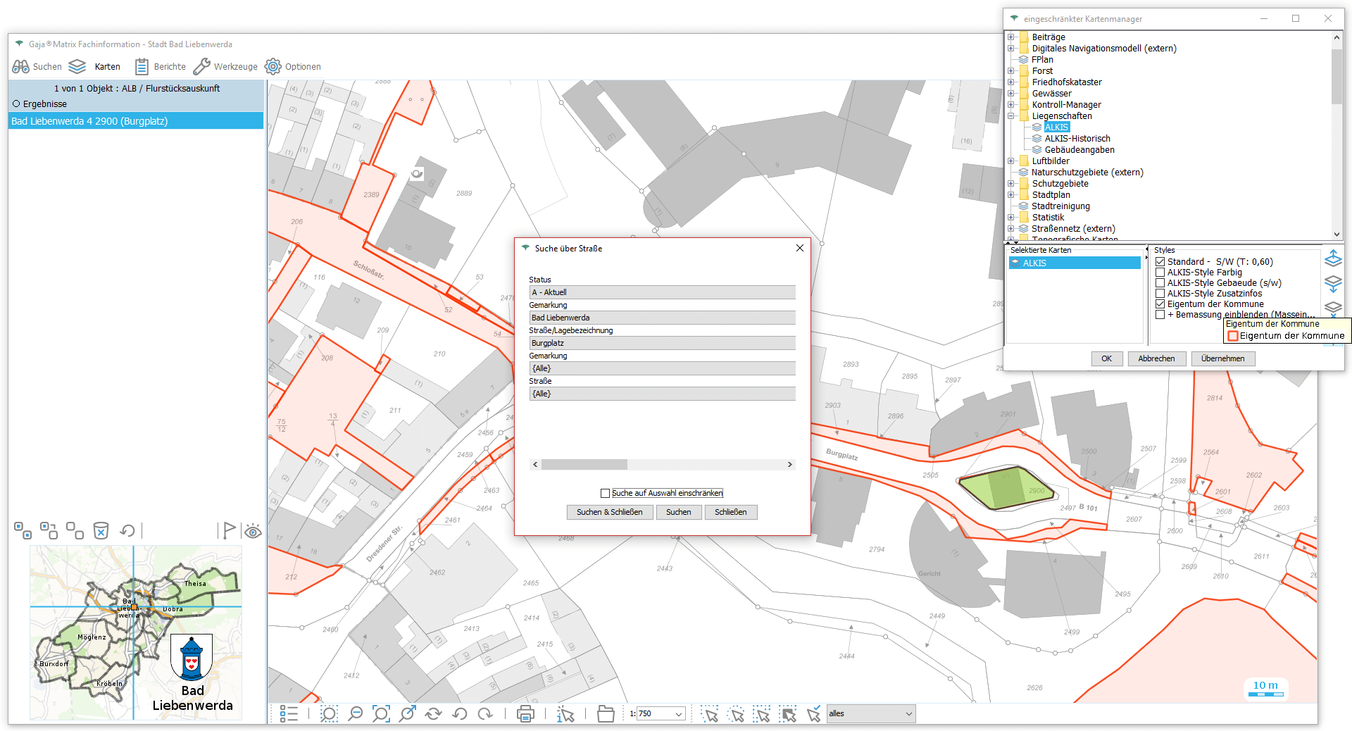 Fachkarten beliebig recherchieren, kombinieren und Darstellungsvariante (Styling) wählen. Hier: Kommunale Flurstücke.
