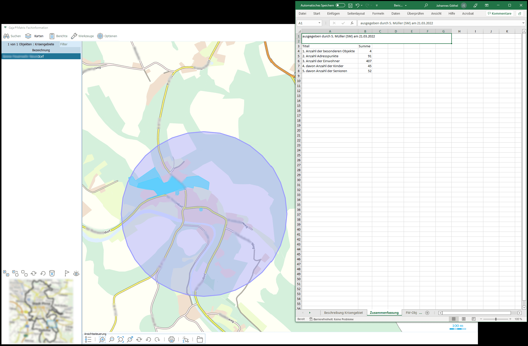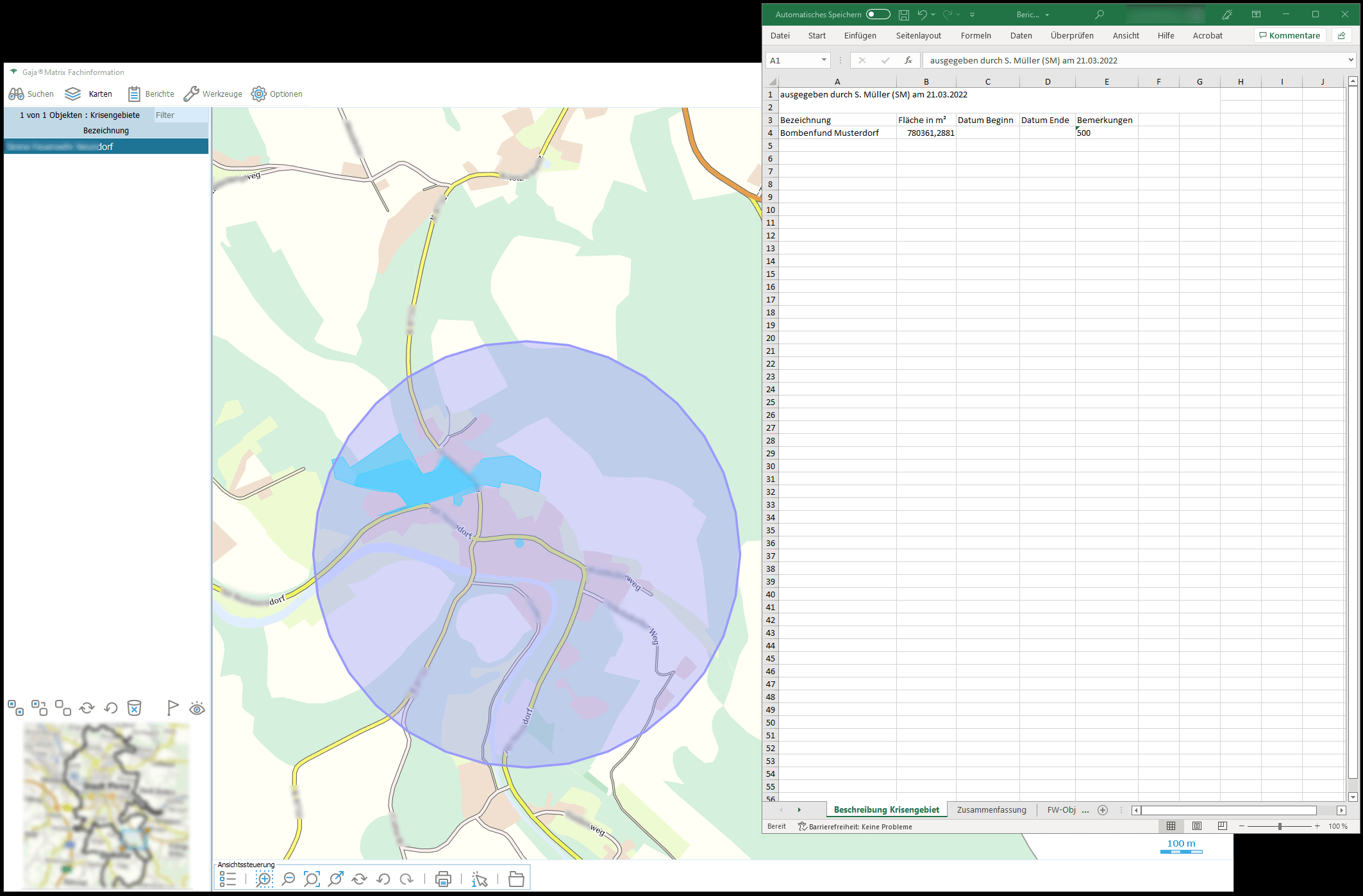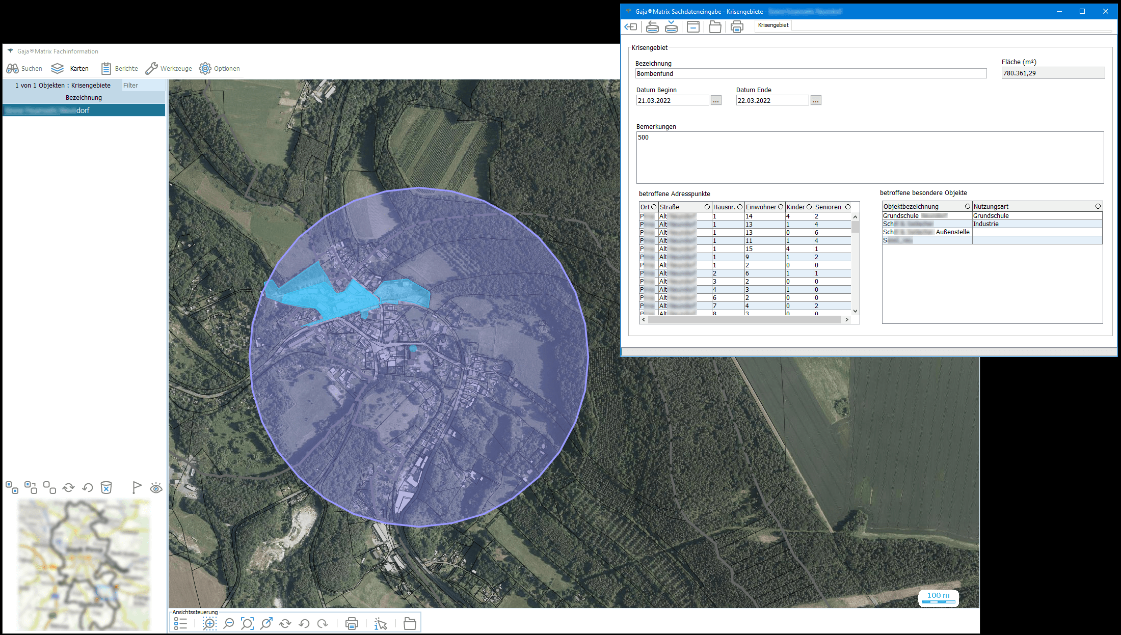 Krisenregion aufspannen (hier: Punkt + Radius 500 m) + automatische Analyse